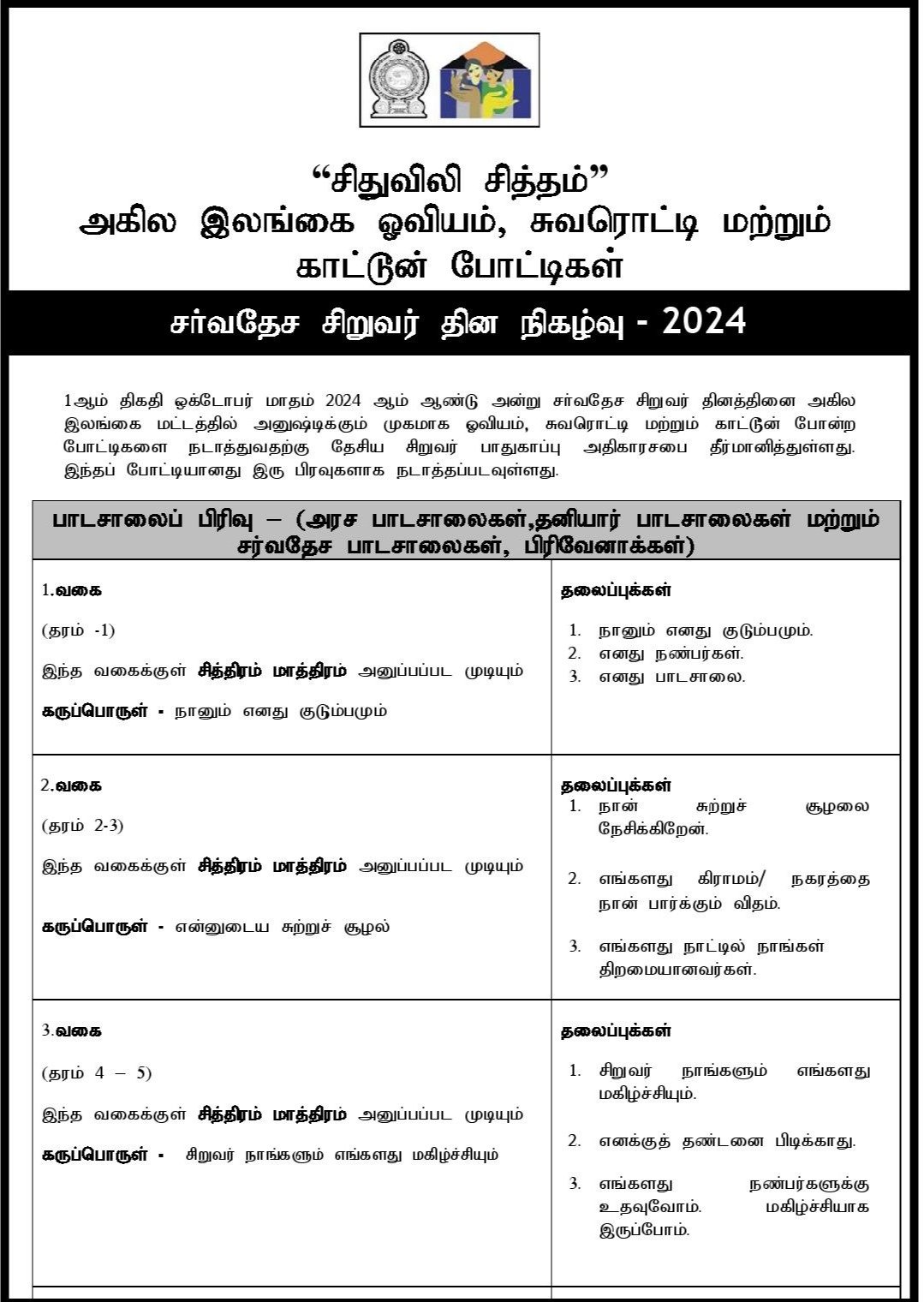 தேசிய சிறுவர் பாதுகாப்பு அதிகார சபையினால் நடாத்தப்படும் தேசிய ரீதியிலான சித்திரம் சுவரொட்டி மற்றும் கார்ட்டூன் போட்டிகள்..