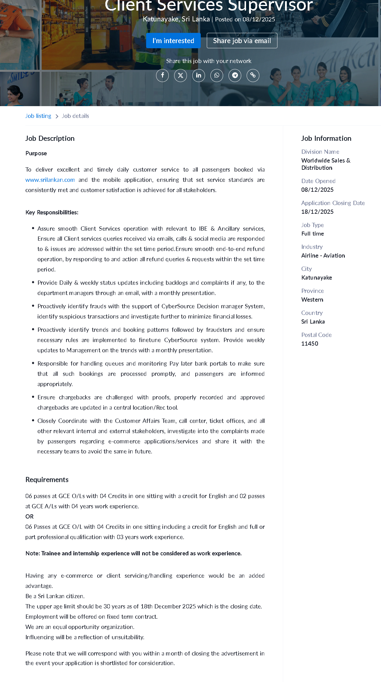 Airport Client service Supervisor-Srilanka airlines 2025 december