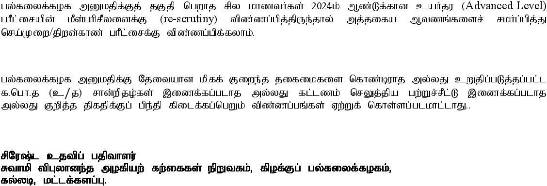 Eastern University (Swami Vipulananda Institute) Aptitude Test Application 2025
