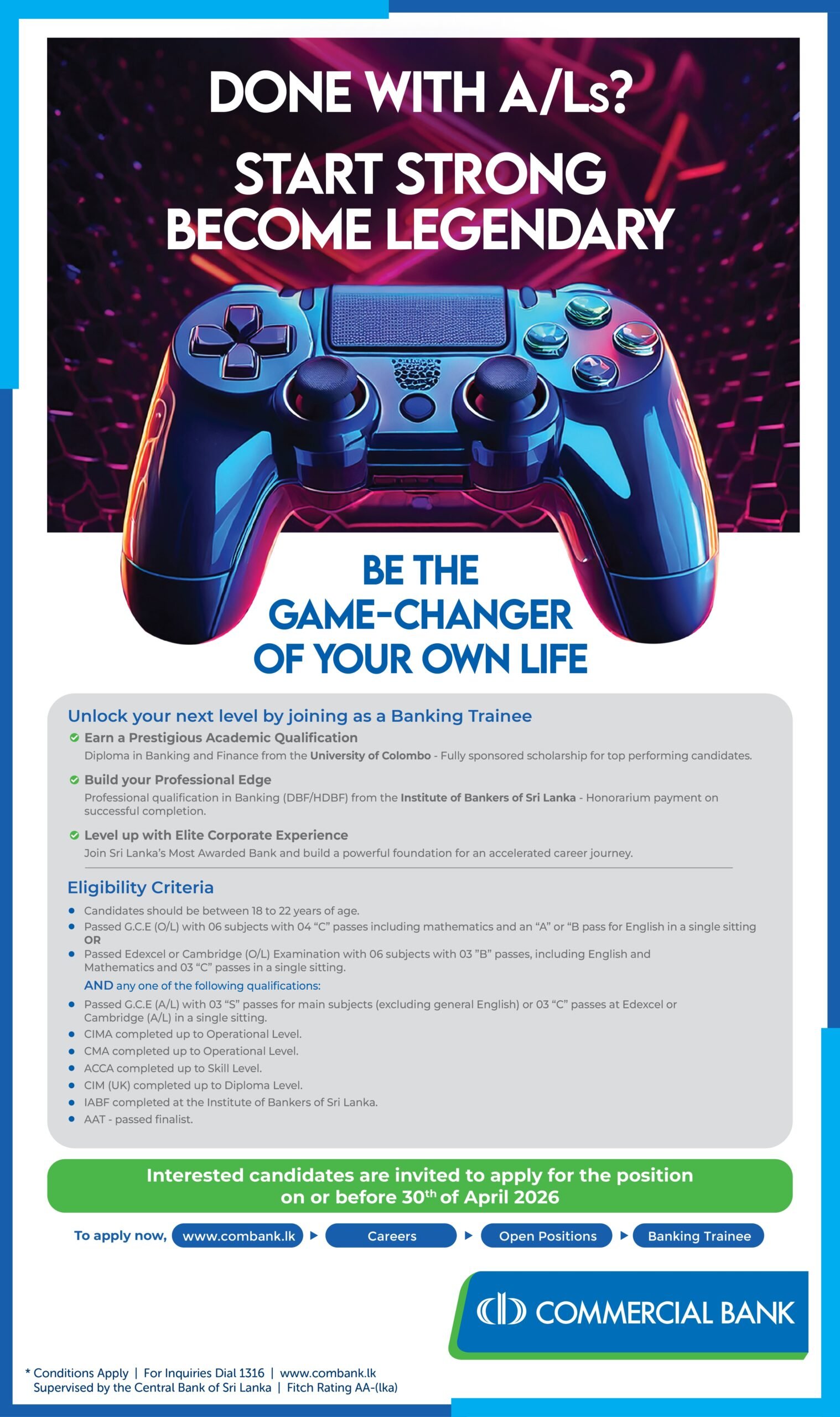 இலங்கையின் முதன்மை தனியார் வங்கியான கொமர்ஷல் வங்கியில் இணைந்து ஒரு கௌரவமான பணியைத் தொடங்க இது ஒரு அரிய வாய்ப்பு.