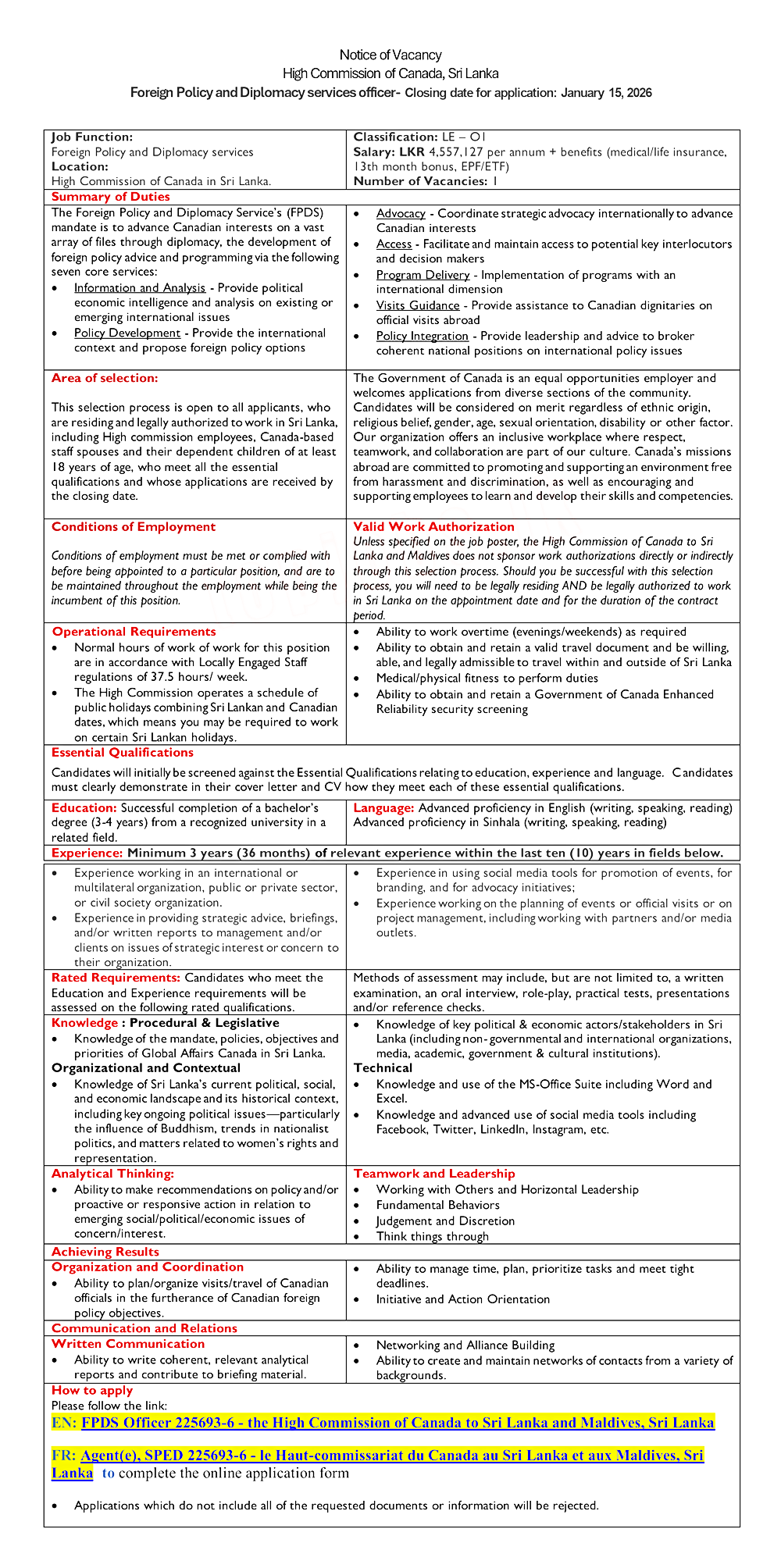 Canada High Commission Job Vacancy 2026 | FPDS Officer – Sri Lanka