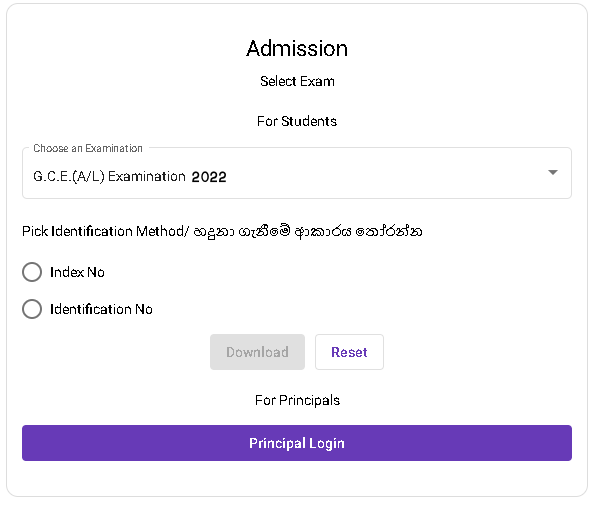 கீழே உள்ள Download என்பதை கிளிக் செய்தவுடன் கீழே கொடுக்கப்பட்டுள்ள மேலே புகைப் படத்தில் காட்டப்பட்டுள்ளவாறு உங்களுக்கு ஒரு திரை தோன்றும்.. Gce AL examination என்பதை select செய்துஉங்களது index no அல்லது identification no இணை அது உங்கள் அனுமதி அட்டையை டவுன்லோட் செய்ய முடியும். கீழே உள்ள