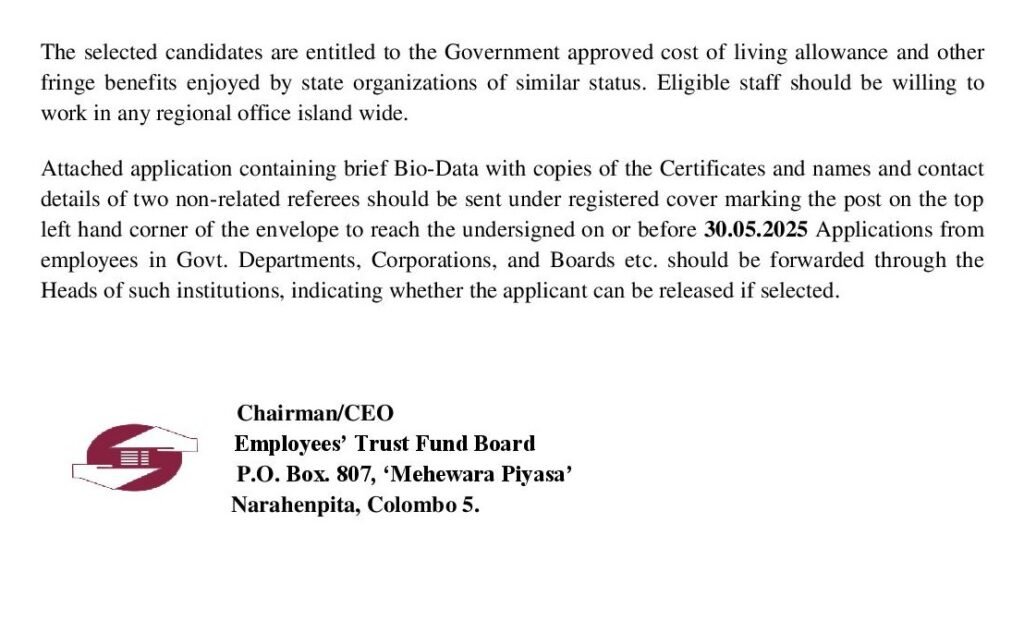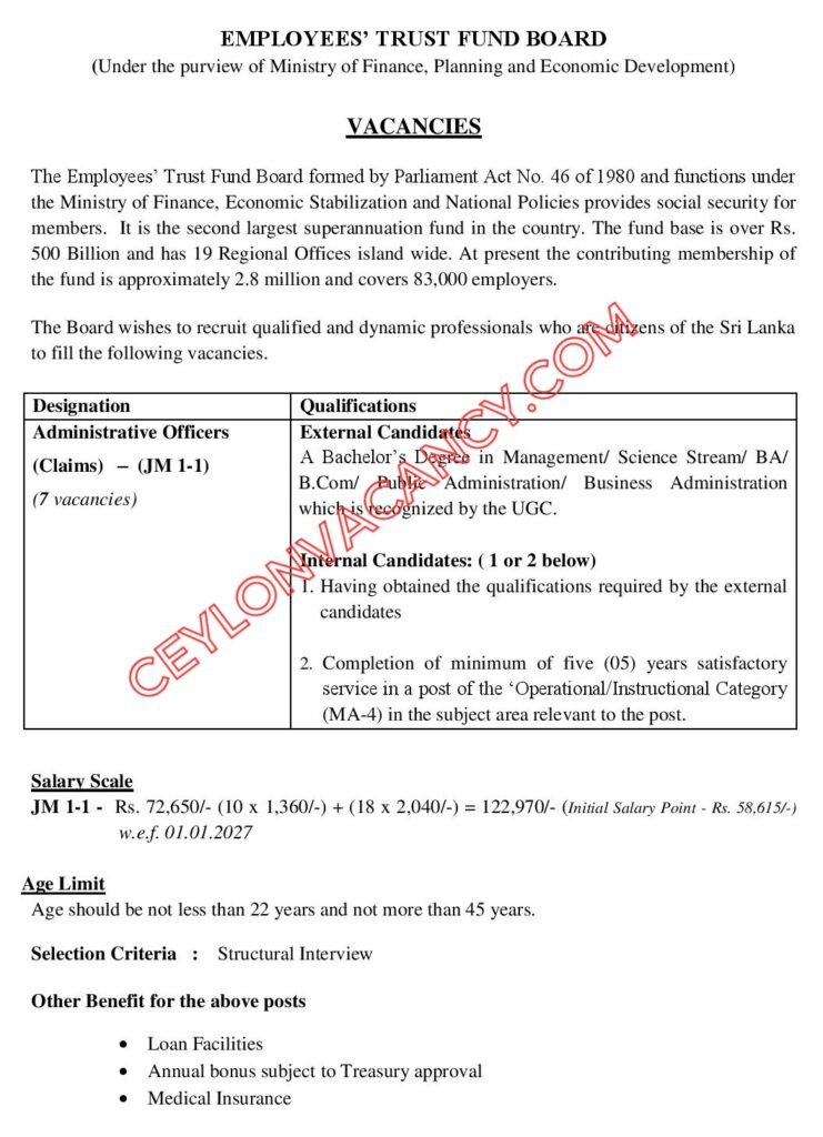Employees’ Trust Fund Board-administrative officer vacancies 2025 May 19, 2025 ceylonvacancy APPLICATION 0 Employees’ Trust Fund Board-administrative officer vacancies 2025 WHATAPP GROUPJOINAPPLICATION FORMDOWNLOAD government jobsgovernment vacancies