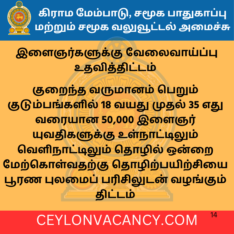 குறைந்த வருமானம் பெறும் 200,000 குடும்பங்களைச் சேர்ந்த 50,000 இளைஞர் யுவதிகளை, உள்நாட்டு மற்றும் வெளிநாட்டு வேலைவாய்ப்புகளைப் பெறும் நோக்கில் தொழிற்திறன் கொண்டவர்களாக மாற்றுவதை இலக்காகக் கொண்டு “Next Sri Lanka” (அடுத்த இலங்கை) என்ற மாபெரும் திட்டம் ஆரம்பிக்கப்பட்டுள்ளது.