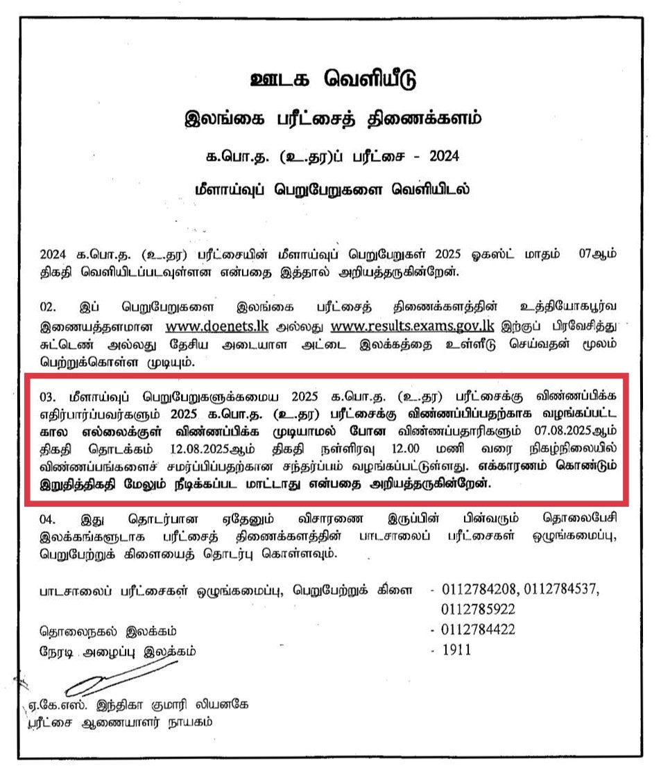 GCE AL Online APPLICATION 2025 June 25, 2025 ceylonvacancy APPLICATION 0 GCE AL Online APPLICATION 2025 Details – Instructions (Private Applicants)DOWNLOADTECHNICAL INSTRUCTIONDOWNLOAD AL பரீட்சைக்கான நிகழ்நிலை விண்ணப்பங்களை AUGUST 8 முதல் AUGUST 12 வரை சமர்ப்பிக்கலாம் எனவும் கூறப்பட்டுள்ளது.