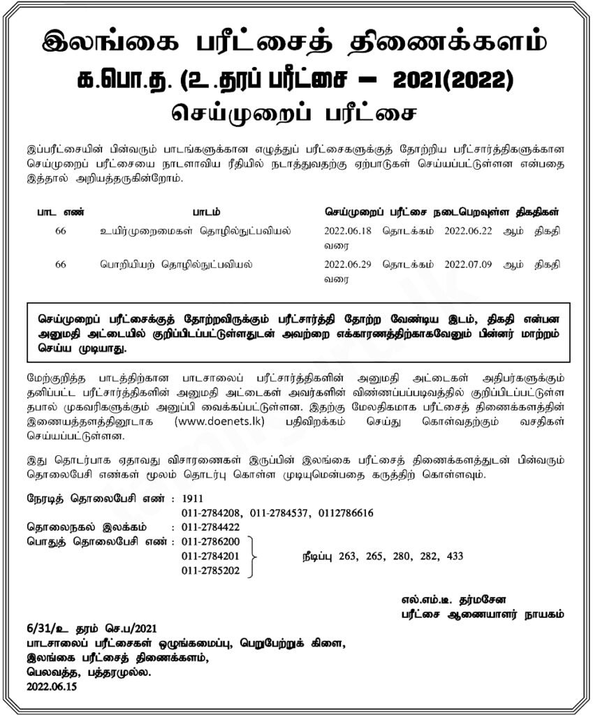 2021 க.பொ.த உயர்தர செய்முறை பரீட்சை நேர அட்டவணையை பரீட்சைத் திணைக்களம் வௌியிட்டுள்ளது.