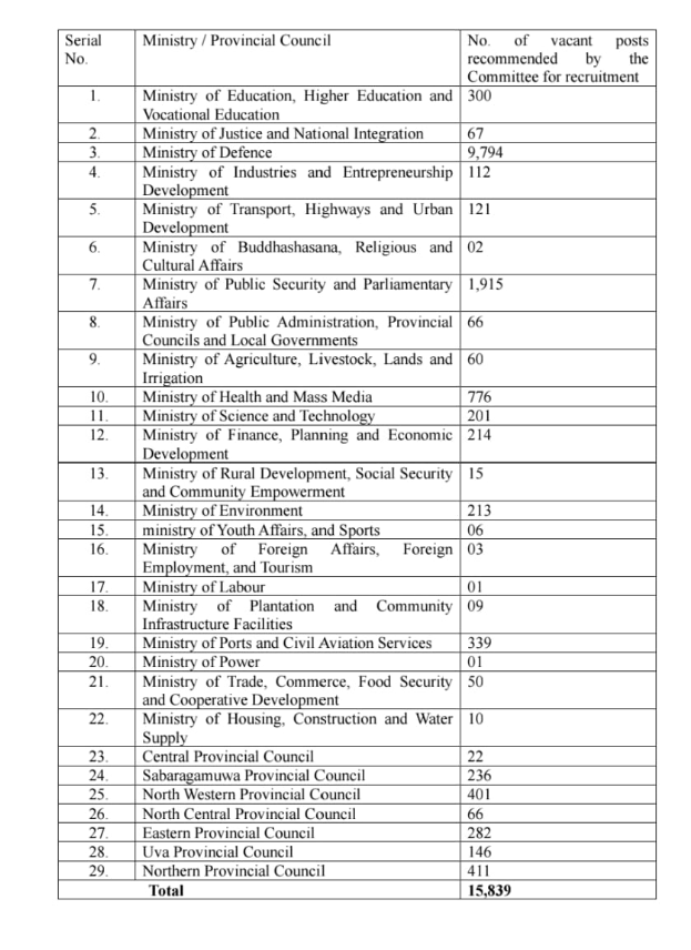 2024.12.30 அன்று அமைச்சரவையால் நியமிக்கப்பட்ட பிரதமரின் செயலாளர் தலைமையிலான விசேட குழுவின் பரிந்துரைகளின்படி, அத்தியாவசிய தேவைகளைக் கருத்திற்கொண்டு 12.02.2026 அன்று அமைச்சரவை பின்வரும் ஆட்சேர்ப்புகளுக்கு அங்கீகாரம் வழங்கியுள்ளது.