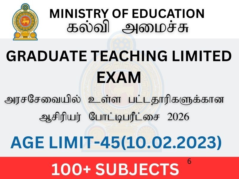 நாட்டிலுள்ள தேசிய மற்றும் மாகாணப் பாடசாலைகளில் நிலவும் சிங்கள, தமிழ் மற்றும் ஆங்கில மொழிமூல ஆசிரியர் வெற்றிடங்களுக்கு, பொதுச் சேவையில் உள்ள பட்டதாரிகளை இலங்கை ஆசிரியர் சேவைக்கு ஆட்சேர்ப்பு செய்வதற்கான போட்டிப் பரீட்சை – 2023 (2026)நாட்டிலுள்ள தேசிய மற்றும் மாகாணப் பாடசாலைகளில் நிலவும் சிங்கள, தமிழ் மற்றும் ஆங்கில மொழிமூல ஆசிரியர் வெற்றிடங்களுக்கு, பொதுச் சேவையில் ஈடுபட்டுள்ள தகுதியுள்ள பட்டதாரி ஆண், பெண் இருபாலாரிடமிருந்தும் விண்ணப்பங்கள் கோரப்படுகின்றன. இதற்கான விண்ணப்பப் படிவம் இலங்கை பரீட்சைத் திணைக்களத்தின் www.doenets.lk என்ற இணையதளத்தில் “Our Services” என்பதன் கீழ் உள்ள “Online Applications – Recruitment Exams/ E.B. Exams” ஊடாக வெளியிடப்பட்டுள்ளதுடன், விண்ணப்பங்களை இணையவழியாக (Online) மாத்திரமே சமர்ப்பிக்க முடியும். இணையவழி விண்ணப்பங்களை ஏற்றுக்கொள்வது 2026 பெப்ரவரி மாதம் 05 ஆம் திகதி மு.ப. 09.00 மணிக்கு ஆரம்பமாவதுடன், 2026 பெப்ரவரி மாதம் 19 ஆம் திகதி பி.ப. 09.00 மணிக்கு நிறைவடையும்.