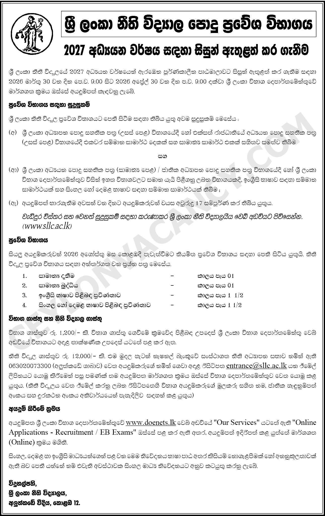 Application for Sri Lanka Law College (SLLC) – Entrance Examination 2026