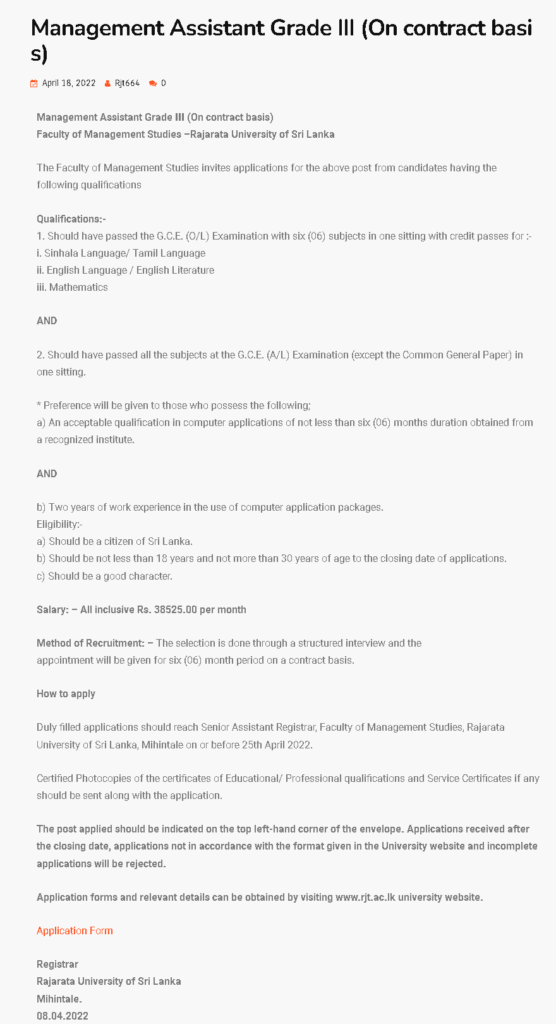 Management assistant-Rajarata university of srilanka 2022
