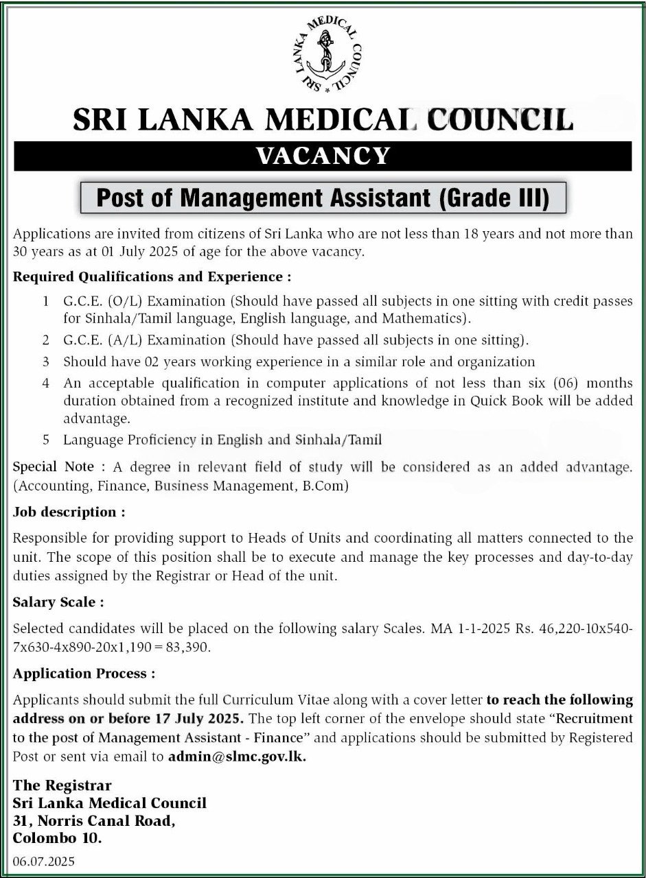 management assistant-Srilanka medical council 2025 July 7, 2025 ceylonvacancy APPLICATION 0 management assistant-Srilanka medical council DOWNLOAD APPLICATIONCLICK HEREJOIN WHATSAPP GROUPJOIN