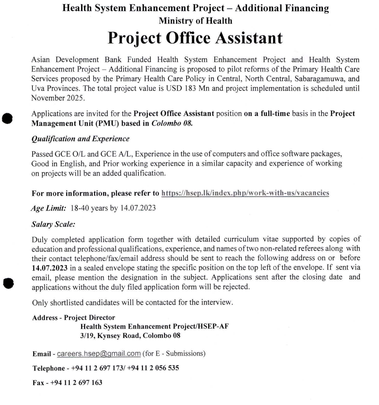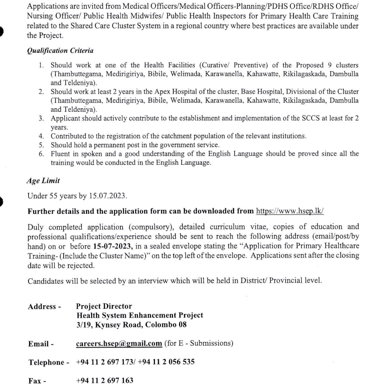 EMAILcareers.hsep@gmail.com என்ற மின்னஞ்சல் வழியாகவும் பதிவுத் தபால் மூலமும் 2023 july 15 ஆம் திகதியன்று அல்லது அதற்கு முன்னராக கிடைக்கும் வகையில் பின்வரும் முகவரியை வந்தடையும் வகையில் அனுப்பப்படல் வேண்டும். தெரிவு செய்யப்பட்ட விண்ணப்பதாரிகள் மாத்திரமே நேர்முகப்பரீட்சையொன்றிற்கு அழைக்கப்படுவார்கள்.
