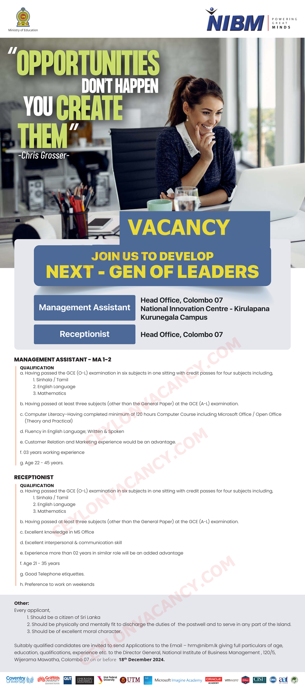 Other: Every applicant, 1. Should be a citizen of Sri Lanka 2. Should be physically and mentally fit discharg e the duties of the postwell and to serve in any part to 3. Should be of excellent moral character. Settings ALTERNATIVE TEXT Describe the purpose of the image. Leave empty if decorative. ASPECT RATIO of the Island Original Suitably qualified candidates are invited to send Applications to the Email – hrm@nibm.lk giving full particulars of age, education, qualifications, experience etc. to the Director General, National Institute of Business Management, 120/5, Wijerama Mawatha, Colombo 07 on or before 18th December 2024.