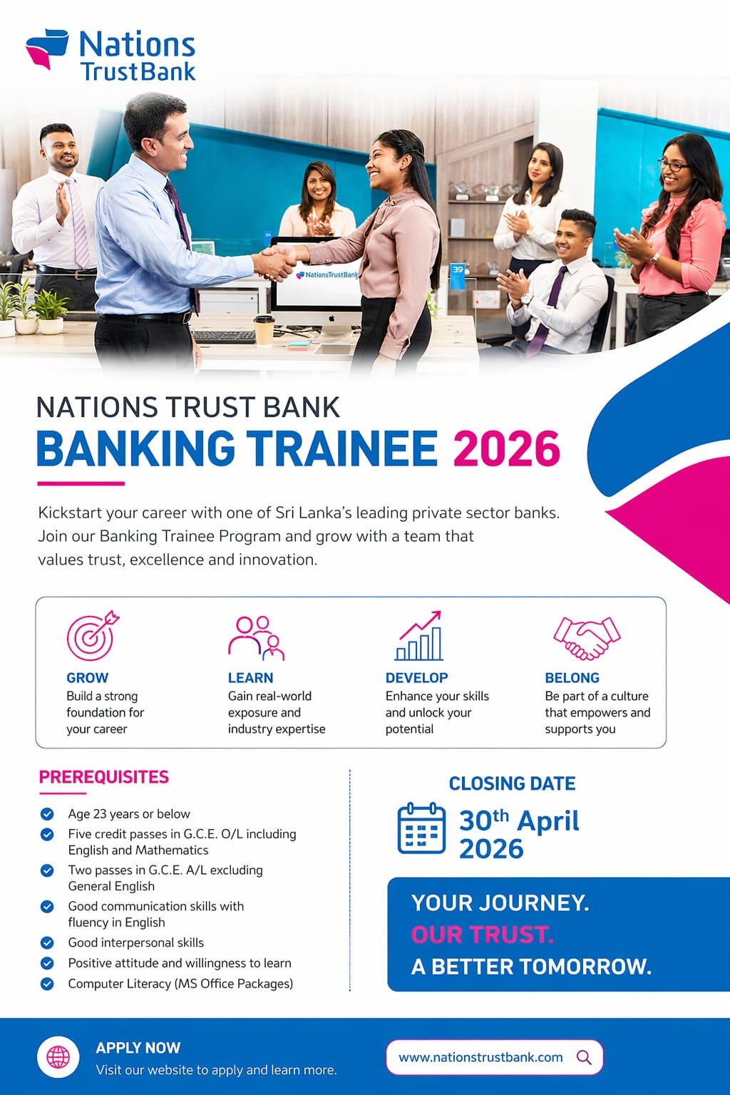 இலங்கையின் முன்னணி தனியார் வங்கிகளில் ஒன்றான நேஷன்ஸ் டிரஸ்ட் வங்கியில் உங்கள் வாழ்க்கையைத் தொடங்குங்கள். எமது வங்கிப் பயிற்சித் திட்டத்தின் மூலம் முன்னேறுங்கள்.