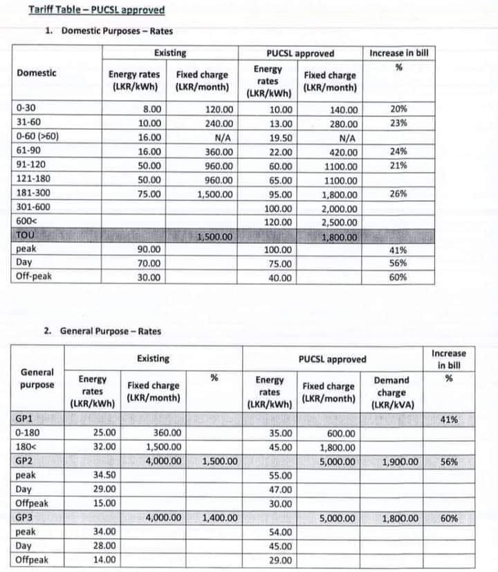 புதிய கட்டணத் திருத்தத்திற்கு அமைவாக, 30 அலகுகள் பயன்பாட்டை கொண்ட வீடொன்றுக்கு இதுவரை காணப்பட்ட 360 ரூபா மின் கட்டணம் 1300 ரூபா வரை அதிகரிக்கப்படும். இது 261% அதிகரிப்பாகும்.