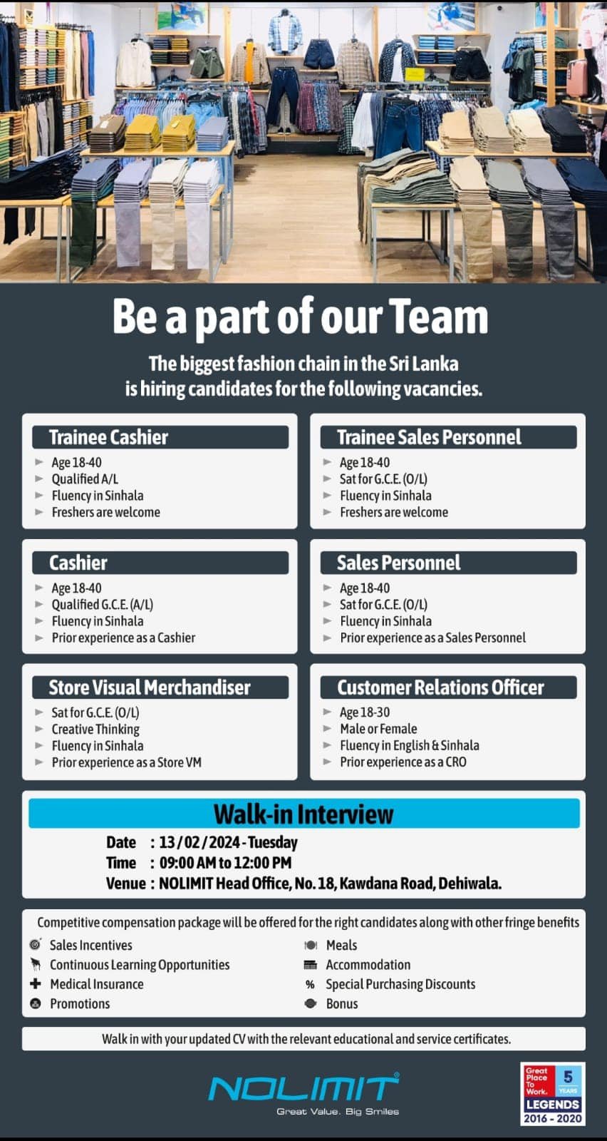 ஆடை விற்பனை துறையில் இலங்கை முழுவதும் கிளைகளைக் கொண்ட மிகவும் பிரபலமான NOLIMIT நிறுவனத்தில் வேலைவாய்ப்புக்கு விண்ணப்பங்கள் கோர்பட்டுள்ளன..