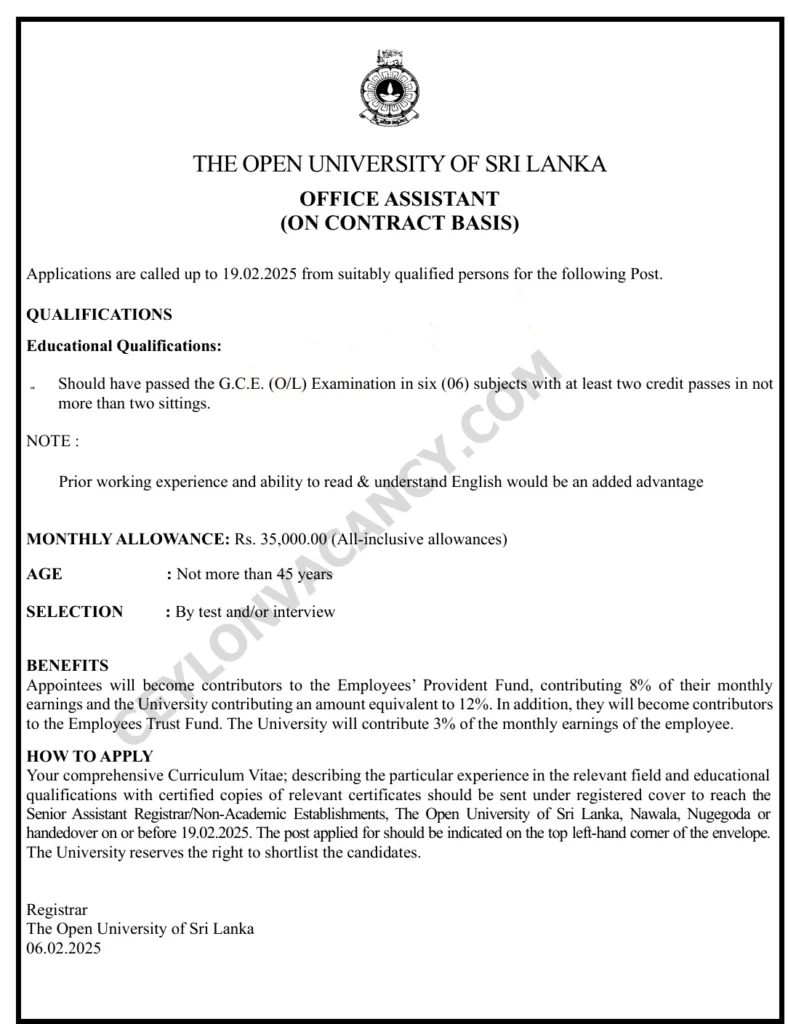 Your comprehensive Curriculum Vitae; describing the particular experience in the relevant field and educational qualifications with certified copies of relevant certificates should be sent under registered cover to reach the Senior Assistant Registrar/Non-Academic Establishments, The Open University of Sri Lanka, Nawala, Nugegoda or handedover on or before 19.02.2025.