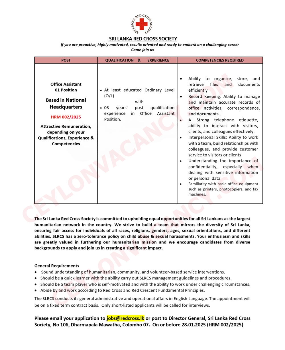 Director General, Sri Lanka Red Cross Society, No 106, Dharmapala Mawatha, Colombo 07