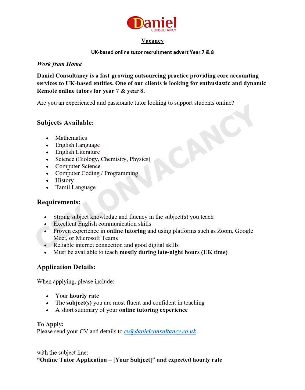 Please send your CV and details to cv@danielconsultancy.co.uk