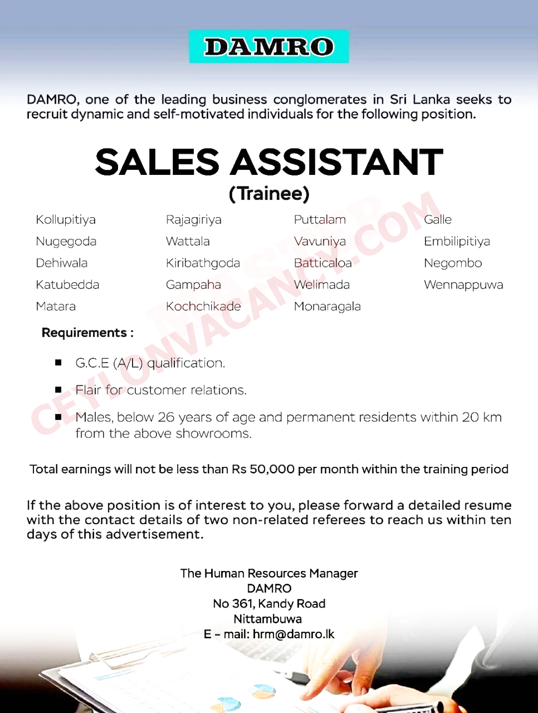 SALE ASSISTANT(TRAINEE) – Damro Vacancies 2024 December 13, 2024 ceylonvacancy APPLICATION 0 SALE ASSISTANT(TRAINEE) – Damro Vacancies 2024 APPLICATION FORM(CLICK HERE) EMAIL YOUR CV TO – hrm@damro.lk