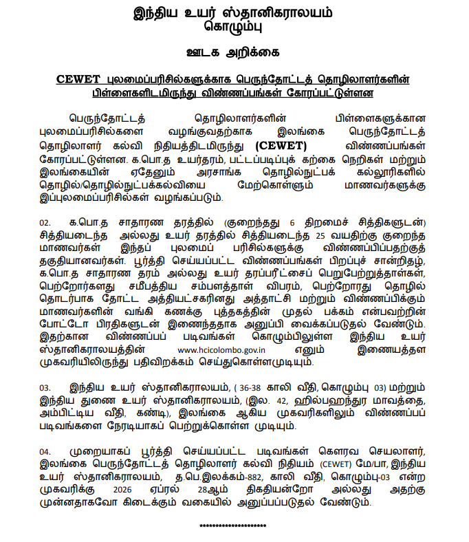 Applications are invited from the children of estate workers, for award of scholarships by the Ceylon Estate Workers’ Education Trust 2026 March 28, 2026 ceylonvacancy APPLICATION 0 Applications are invited from the children of estate workers, for award of scholarships by the Ceylon Estate Workers’ Education Trust 2026 DOWNLOAD APPLICATIONDOWNLOADJOIN WHATSAPP GROUPJOIN