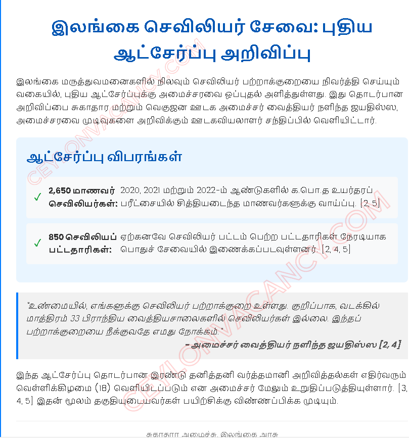 Sri Lankan Government Approves Hiring of 2,650 Student Nurses and 850 Graduates July 16, 2025 ceylonvacancy APPLICATION 0 Sri Lankan Government Approves Hiring of 2,650 Student Nurses and 850 Graduates NURSING வர்த்தமானி மற்றும் விண்ணப்பம் தமிழ் மொழியில் வெளியானதும் பெற்று கொள்ள நமது வழிகாட்டல் குழுவில் இணையவும்-JOIN WHATSAPP GROUP