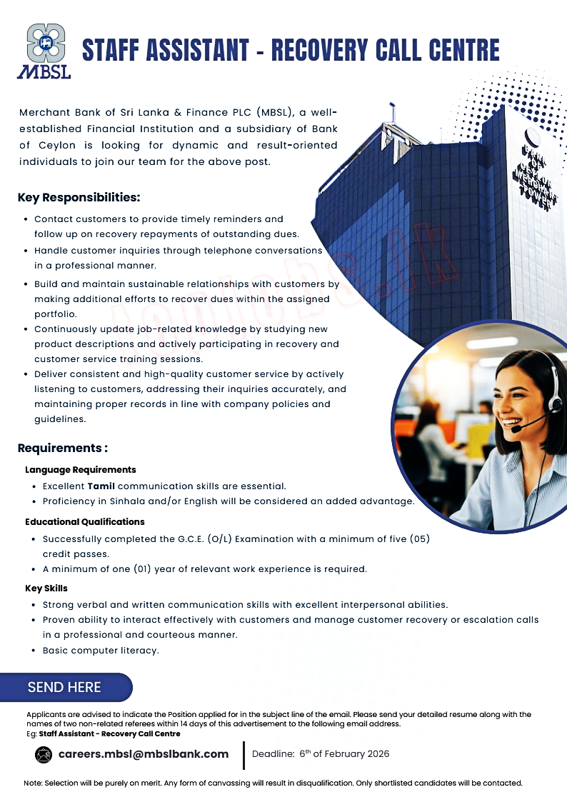 Staff assistant-merchant bank of srilanka 2026 January 26, 2026 ceylonvacancy APPLICATION 0 Staff assistant-merchant bank of srilanka 2026 SEND YOUR CV TO EMAIL- careers.mbsl@mbsibank.com