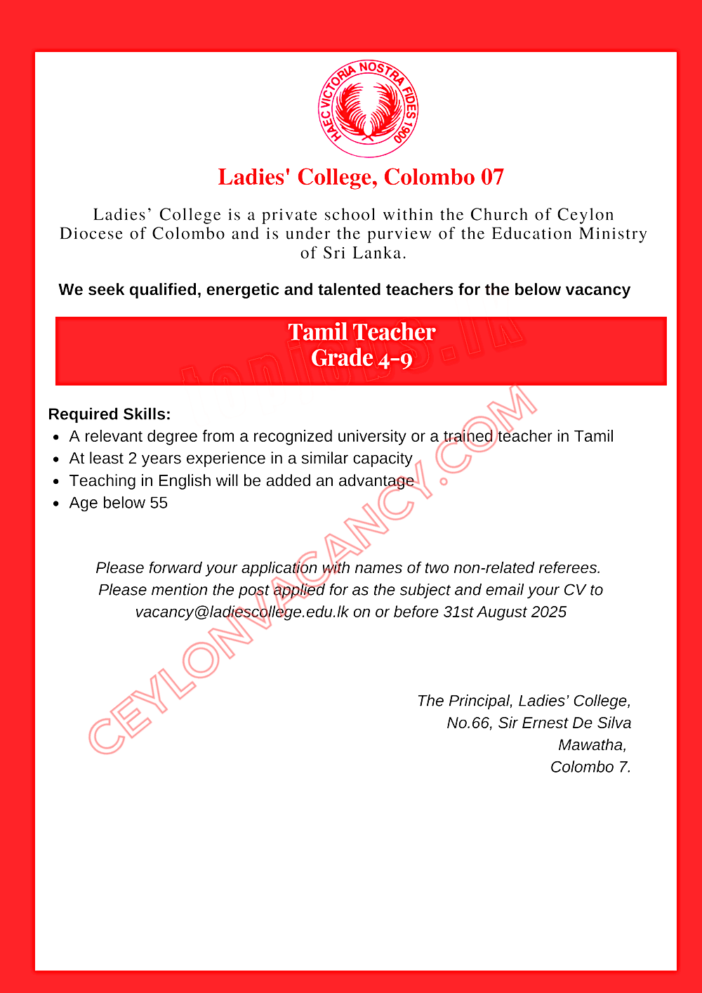 Please forward your application with names of two non-related referees. Please mention the post applied for as the subject and email your CV to vacancy@ladiescollege.edu.lk on or before 31st August 2025