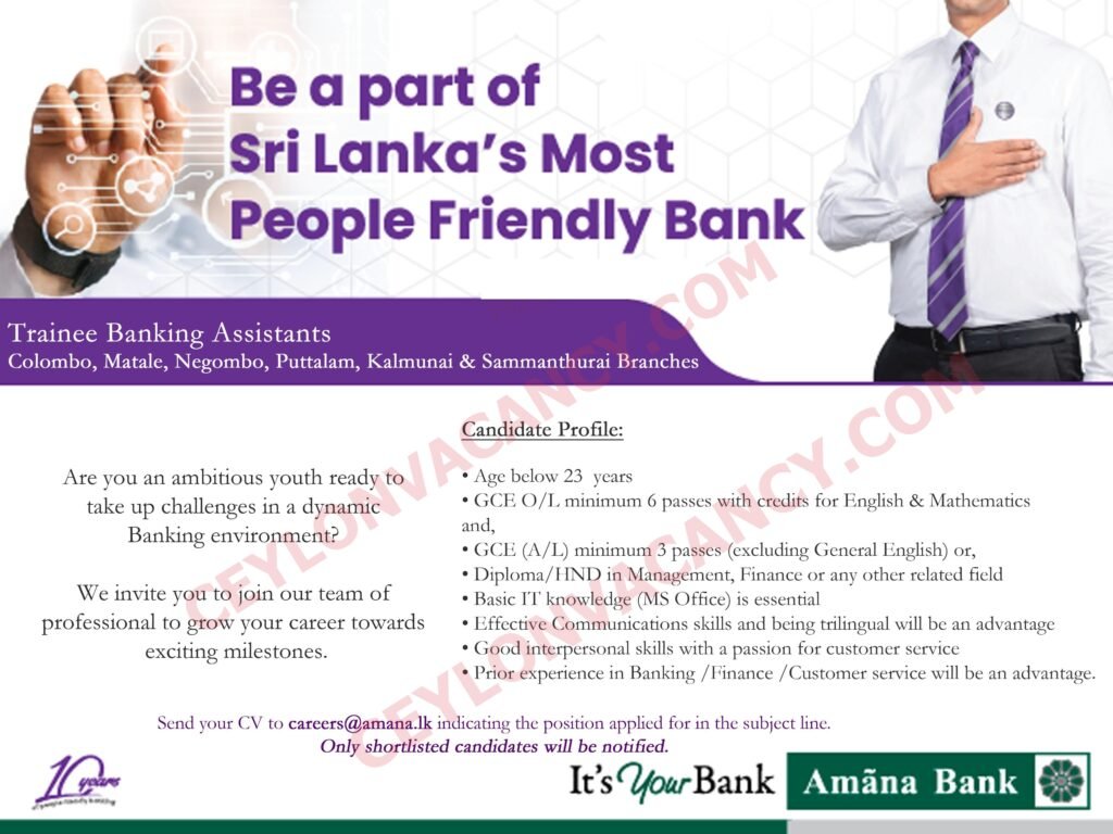 பிரபலமான வணிக வங்கிகளுள் ஒன்றான Amana வங்கியில் சம்பளத்துடன் கூடிய TRAINEE BANKING ASSISTANT இற்கு விண்ணப்பம் கோரப்பட்டுள்ளன..