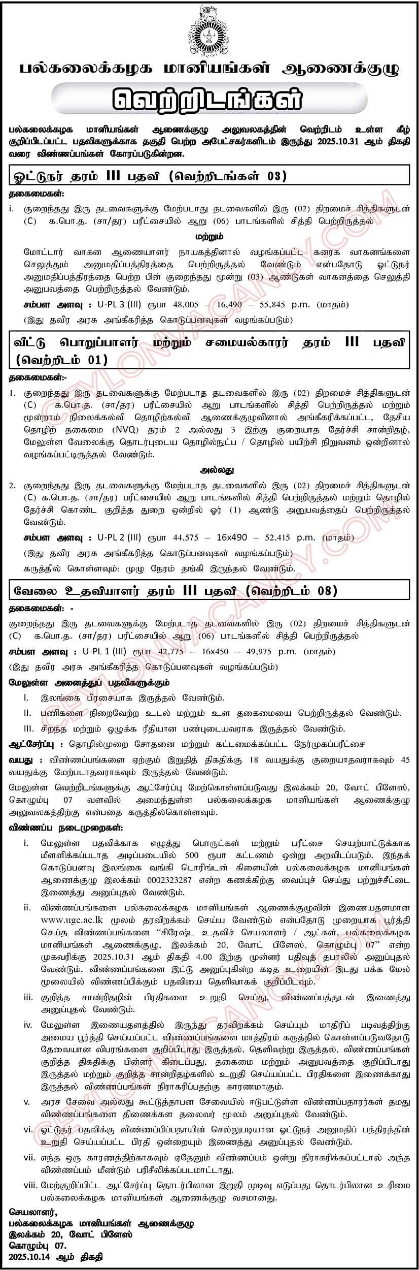 UGC Job Vacancies 2025 – Driver, House Guardian & Works Assistant October 17, 2025 ceylonvacancy APPLICATION 0 UGC Job Vacancies 2025 – Driver, House Guardian & Works Assistant APPLICATION PENDING