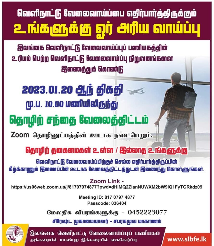 இலங்கை வெளிநாட்டு வேலை வாய்ப்பு பணியகம் நடத்தும் வெளிநாட்டு வேலை வாய்ப்பு களுக்கான நேர்முகப் பரீட்சை – zoom ஊடாக நடைபெறும்..