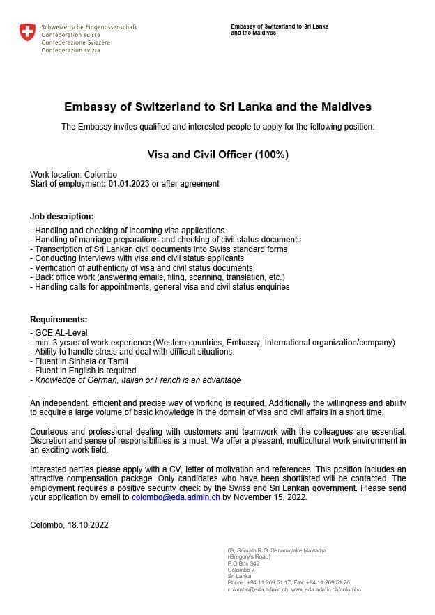 VISA& CIVIL OFFICER-SWITZERLAND Embassy in Sri Lanka