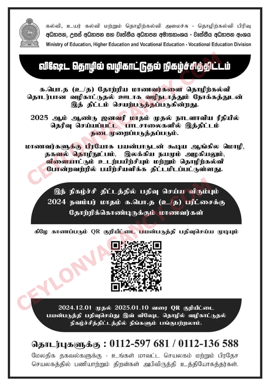 Special Career Guidance Program This program aims to introduce vocational Education to students who complete G.C.E (A/L) It will be implemented from 2025 January in selected schools throughout the country It is planned to provide practical training as well as theoretical training on vocational education with English language, ICT, Literature & Aesthetic, Sports & Fitness to the students.