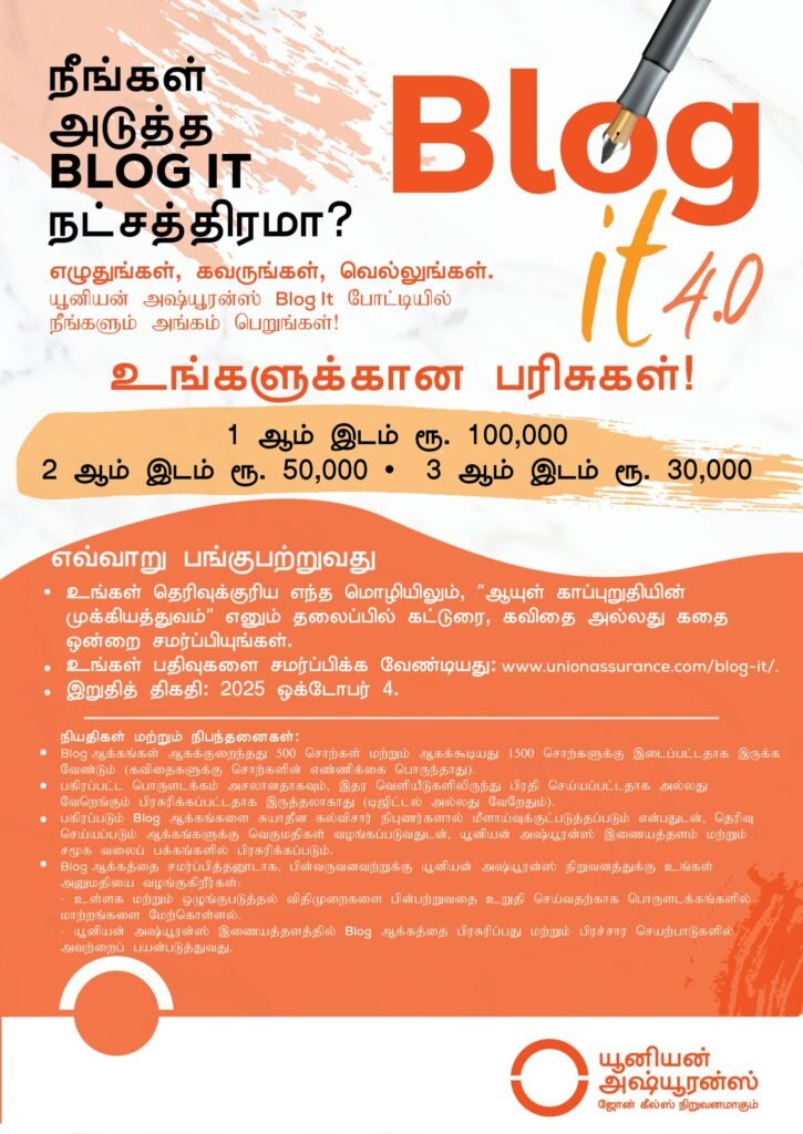 யூனியன் அஷ்யூரன்ஸ் வருடாந்த Blog It போட்டி, தொடர்ச்சியான 4ஆவது தடவையாகவும் முன்னெடுக்கப்படுகிறது. உங்களின் எழுத்தாற்றல் திறமையை வெளிப்படுத்தவும், மொத்தம் ரூ. 180,000 இலிருந்து பரிசுகளை வெல்லும் வாய்ப்பையும் வழங்குகிறது!