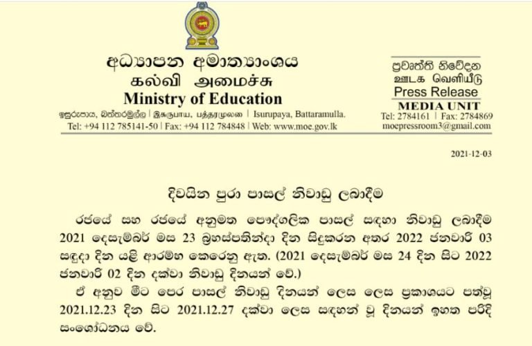 ஏற்கனவே வெளியிட்டிருந்த அறிவித்தலின் படி பாடசாலை விடுமுறைகள் எதிர்வரும் டிசம்பர் மாதம் 23 ஆம் திகதி தொடக்கம் 26 மட்டுமே விடுமுறை வழங்கப்பட்டுள்ளதாக அறிவிக்கப்பட்டிருந்தது..