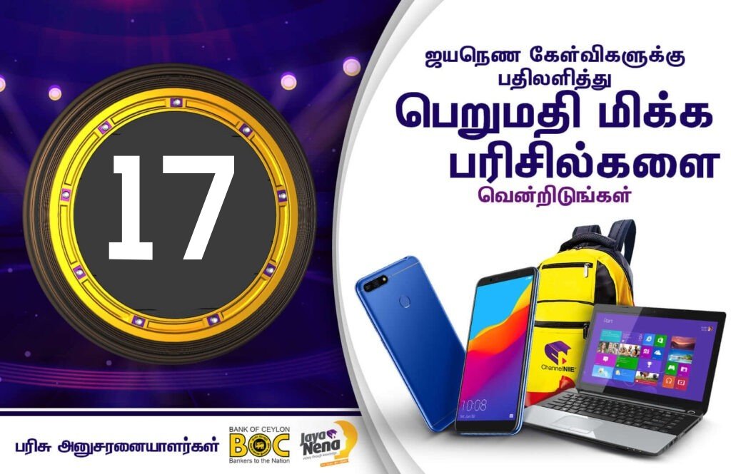 பாடசாலை மாணவர்களுக்கான ஜயநென போட்டி இலக்கம் 17 இற்கான வினாக்கள் வௌியிடப்பட்டுள்ளன. சரியான விடைகளை சமர்ப்பித்து பெறுமதிமிக்க பரிசில்களை வெல்லுங்கள்