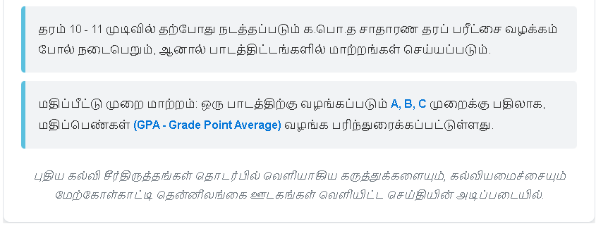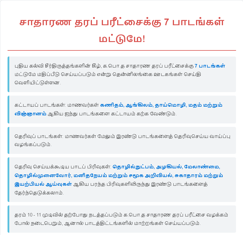 2026 ஆம் ஆண்டு முதல் அமுலாகவுள்ள க.பொ.த. சாதாரண தர பரீட்சையின் புதிய பாட அமைப்பையும், GPA (Grade Point Average) மதிப்பீட்டு முறையையும் பற்றிய முழுமையான தகவல்கள் இங்கே வழங்கப்படுகின்றன.