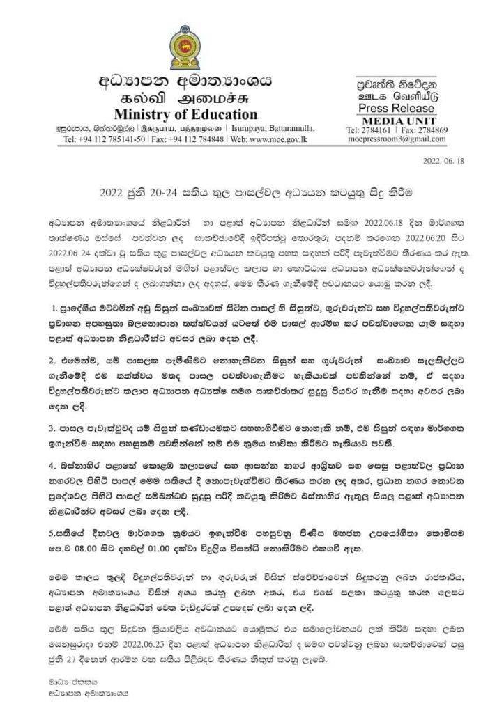 உங்கள் பாடசாலை நடைபெறுமா இல்லையா என்பதை குறித்த பாடசாலை மட்ட அதிபர் அல்லது வலயமட்ட கல்வி அதிகாரிகள் மூலமாக தீர்மானிக்கப்படும்.. போக்குவரத்து வசதிகள் பிரச்சினையாக உள்ள மாணவர்களை பாடசாலைக்கு சமூகமளிக்க முடியாவிட்டாலும் உங்கள் பாடசாலையின் அதிபர் அல்லது ஆசிரியருக்கு அறிவிப்பதன் மூலம் ஒன்லைன் மூலமான வசதியை ஏற்படுத்திக் கொள்ள கூடிய சாத்தியக்கூறுகளை ஆராய முடியும்.. எனவே உங்கள் பாடசாலை மட்ட அதிபர் அல்லது ஆசிரியர்களை தொடர்புகொண்டு இது தொடர்பாக வினவி முடிவுக்கு வரவும்.