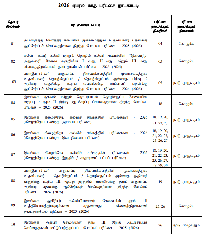 APRIL EXAM CALENDAR 2026-FULL NOTICE March 6, 2026 ceylonvacancy Government exams 0 APRIL EXAM CALENDAR 2026-FULL NOTICE பரீட்சை வழிகாட்டி குழுக்கள் கிராம அலுவலர் சேவை வினாத்தாள்கள் & வழிகாட்டல்கள் இணையுங்கள் TEACHING SERVICE இணையுங்கள் ICT சேவை (SLICTS) தொழில்நுட்ப செய்திகள் இணையுங்கள்