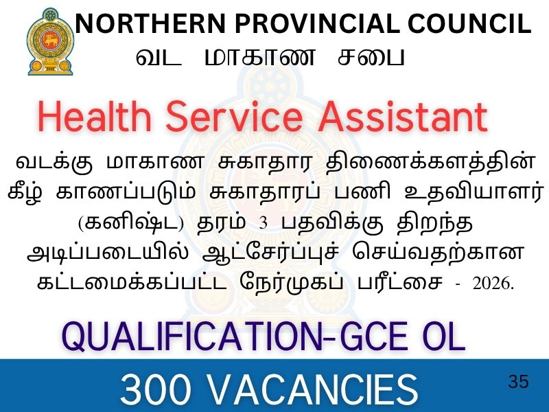 Post of Health Service Assistant (Junior) Grade III – Health Department of the Northern Provincial Council – 2026