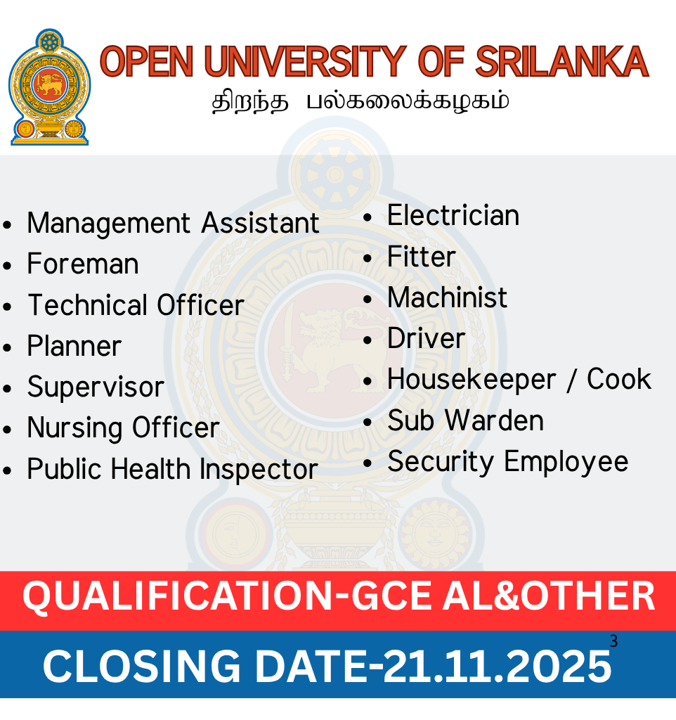 Management Assistant, , Technical Officer, , Supervisor, Nursing Officer, Public Health Inspector &more jobs – OPEN UNIVERSITY 2025