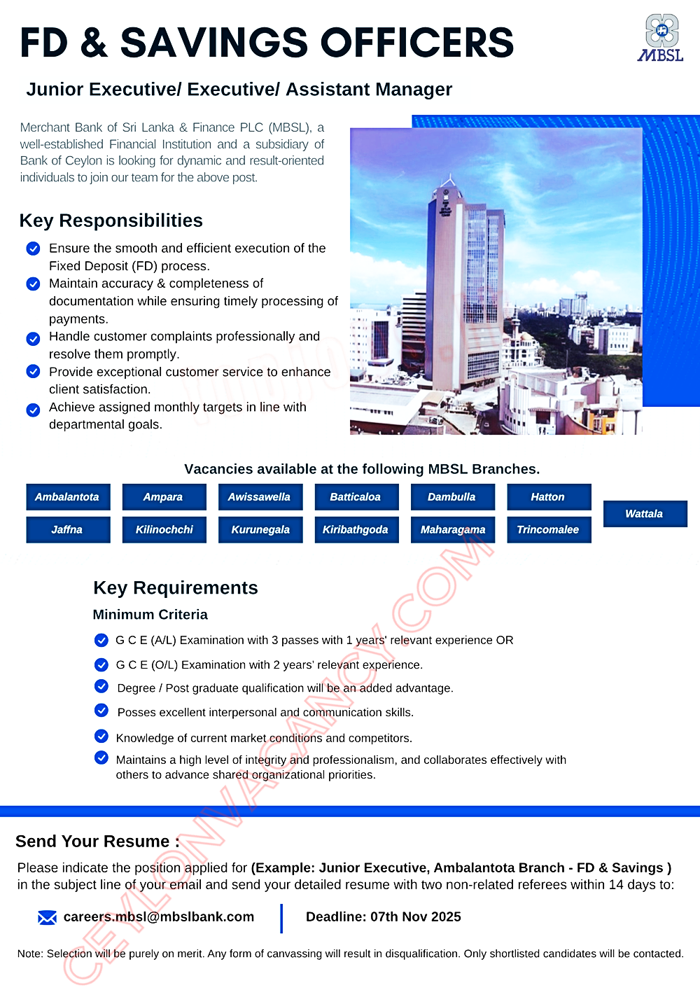 FD&SAVINGS OFFICER -Merchant Bank of Sri Lanka & Finance PLC Vacancies 2025