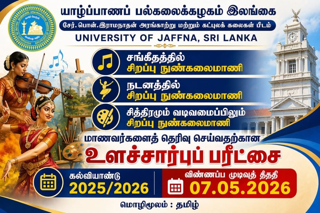 Apply for the University of Jaffna Ramanathan Academy Aptitude Test 2025/2026 for Fine Arts (Music, Dance, Art & Design). Deadline: 07.05.2026. Apply online now!